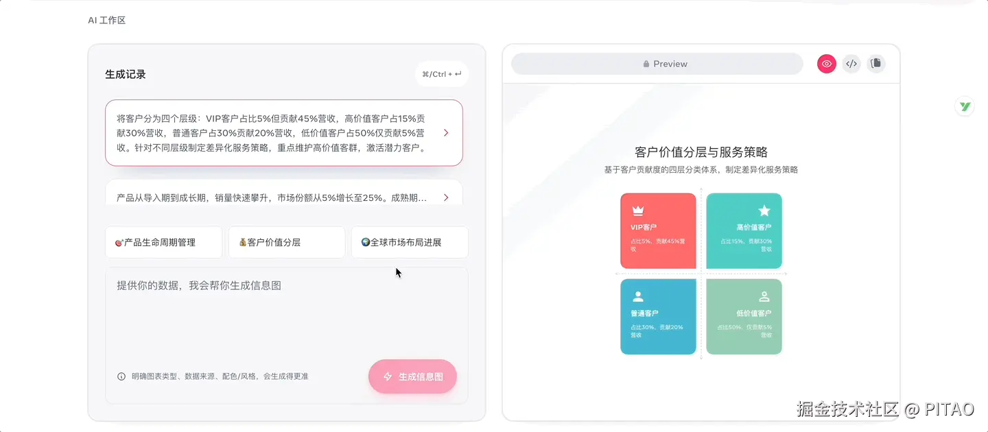 大家应该都有同感:在使用传统 LLM 时,面对 AI 返回的一大段密集文字,人脑的解析效率其实是很低的。我们渴望的不是更多的字符,而是 更高的信息密度 ** 和 更直观的呈现形式**。