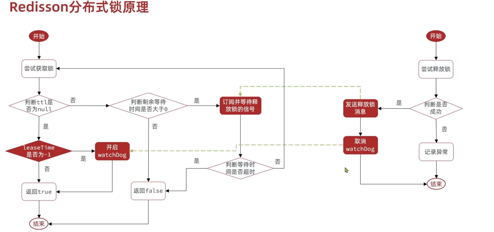 Redisson 的分布式锁流程图可以看成"获取锁"和"释放锁"两个流程,中间由 WatchDog 续命机制串联起来。下面按图逐步解释