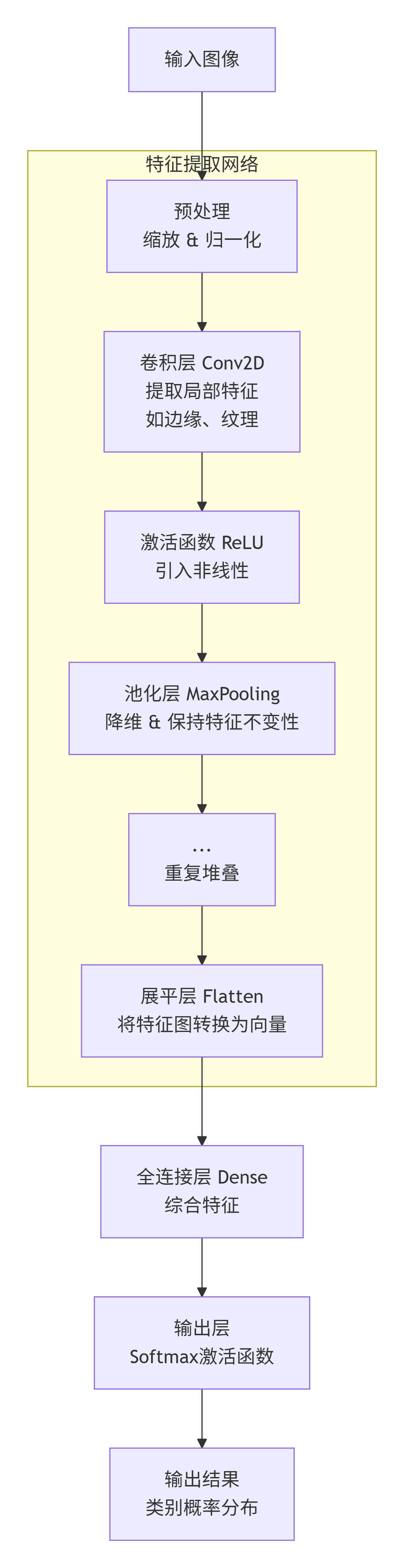 该流程图直观地展示了一个典型CNN进行图像分类的核心步骤: