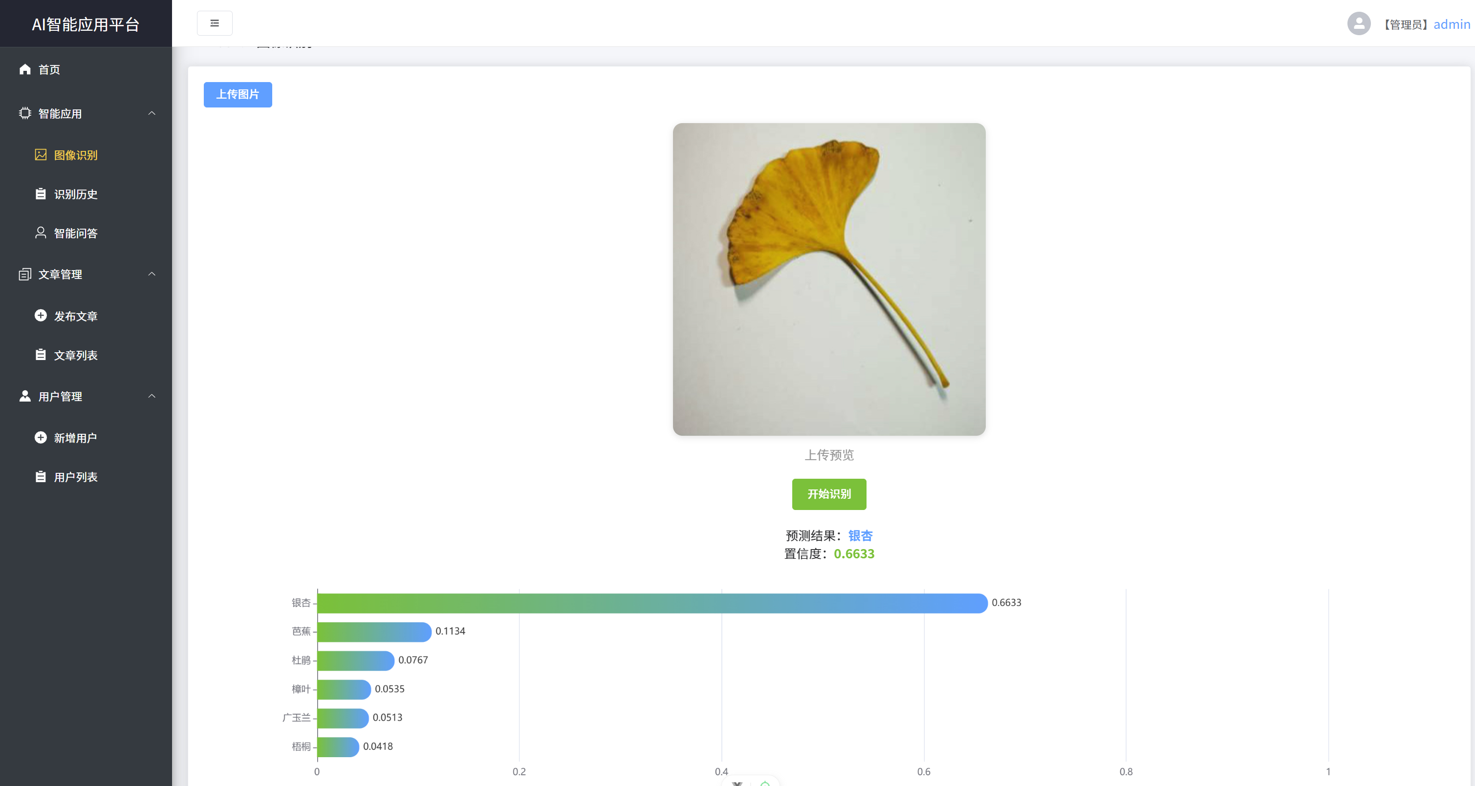 随着人工智能技术的快速发展,基于深度学习的图像识别方法在多个领域展现出广泛应用价值。在植物学研究与日常植物识别场景中,传统识别方式依赖人工经验,效率较低且存在主观性差异。本项目基于TensorFlow框架,采用卷积神经网络算法,构建一个针对六类常见植物叶片(广玉兰、杜鹃、梧桐、樟叶、芭蕉、银杏)的图像识别模型,实现高效、自动化的植物种类判别。为进一步提升系统的实用性与可及性,项目结合Django与Vue3等主流开发技术,搭建了一套支持Web交互的可视化操作平台。系统不仅提供高精度植物识别功能,还集成文章管理、数据可视化及智能问答等模块,有效拓展了系统在科普教育与实际应用中的服务能力,为植物识别与管理提供了一种智能化解决方案。
