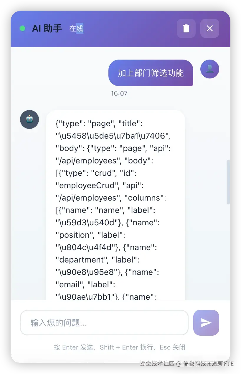 在实际应用中,当用户提出"创建一个员工管理页面"的需求后,紧接着说"加上部门筛选功能",系统能自动理解后者是前者的补充和细化,而非一个独立的新需求。这种连贯的交互体验大大降低了沟通成本,使开发者能够像与人类同事合作一样与智能体进行交流。支持一键导入生成代码功能,用户点击一键导入,前端将AI生成页面代码,直接写入低代码平台代码编辑区域,快速写入页面。效果展示: