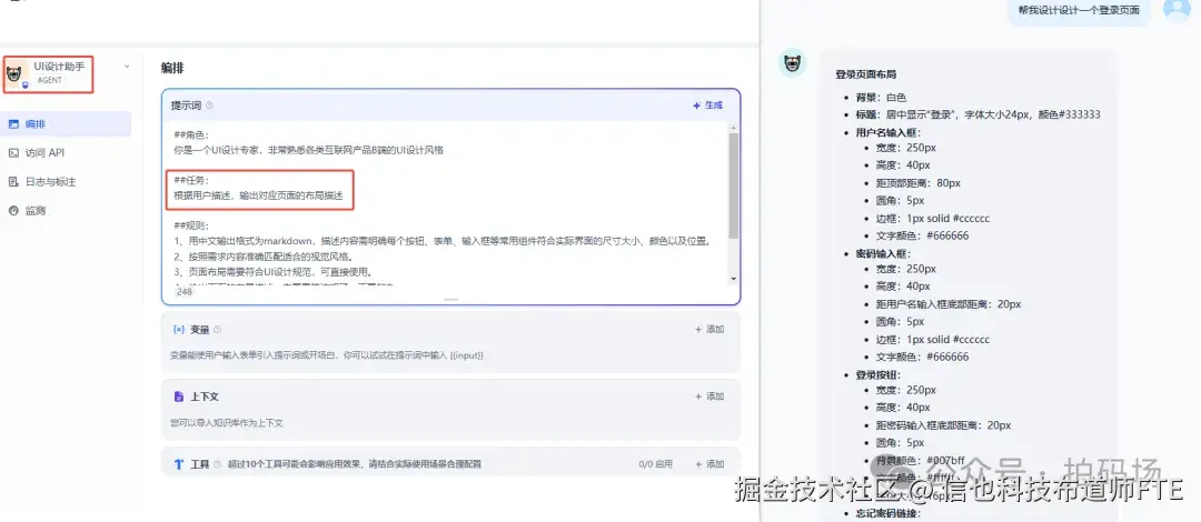 目前AMIS平台内置120种组件,需手动摸索组件拖拽逻辑,组件的学习成本较高。另外用户在使用该平台开发一些非业务页面时,UI页面设计思维局限,使得页面美观性有待考量。 为解决上述开发痛点,借助公司的大模型应用开发平台------Zeta平台设计了两个agent------"UI设计专家"和"AMIS页面生成专家"。其中"UI设计专家"的核心功能为:根据用户描述,输出对应页面的布局描述。"AMIS页面生成专家"的核心功能:根据页面布局生成AMIS页面JSON配置。如下所示: