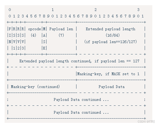 • mask: 表⽰是否要对数据载荷进⾏掩码操作。从客⼾端向服务端发送数据时,需要对数据进⾏掩码操作;从服务端向客⼾端发送数据时,不需要对数据进⾏掩码操作。