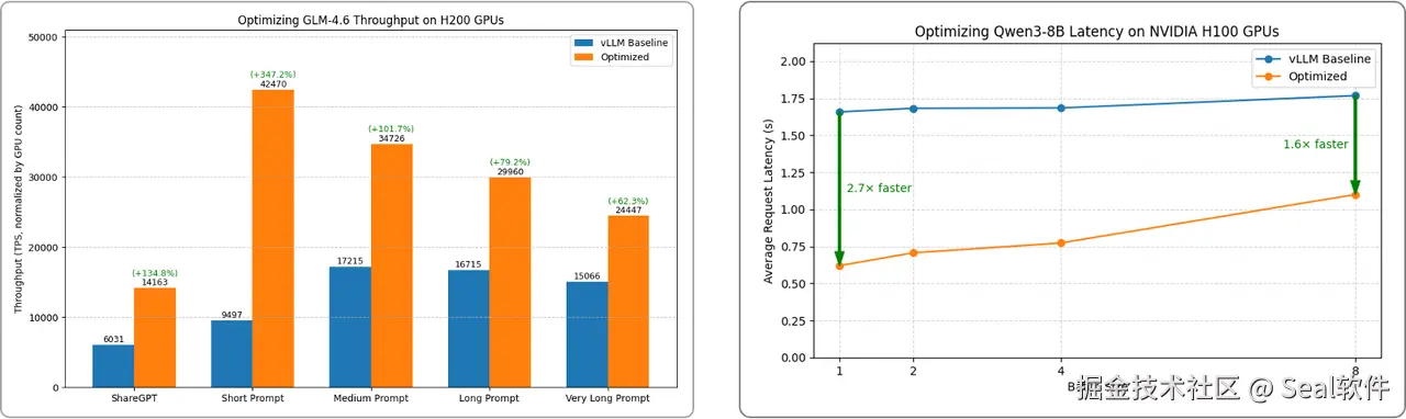 内部测试数据显示,通过最佳引擎选型和配置调优组合,H200 GPU 上运行 GLM 4.6 的吞吐量最高可提升 135% ;H100 GPU 上运行 Qwen3-8B 的响应延迟最高可降低 63% 。
