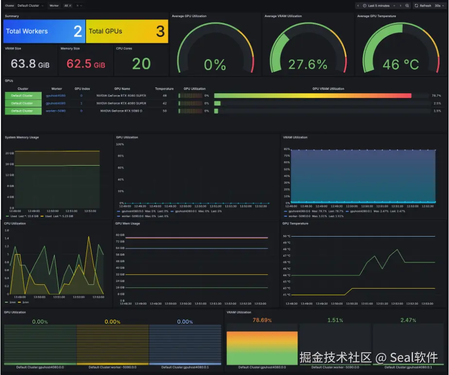 对每张 GPU、每个节点的计算利用率、显存占用、负载状态等关键指标进行可视化监控,让算力分配与集群调度一目了然。帮助运维团队快速发现瓶颈,优化资源使用,提高整体系统效率。