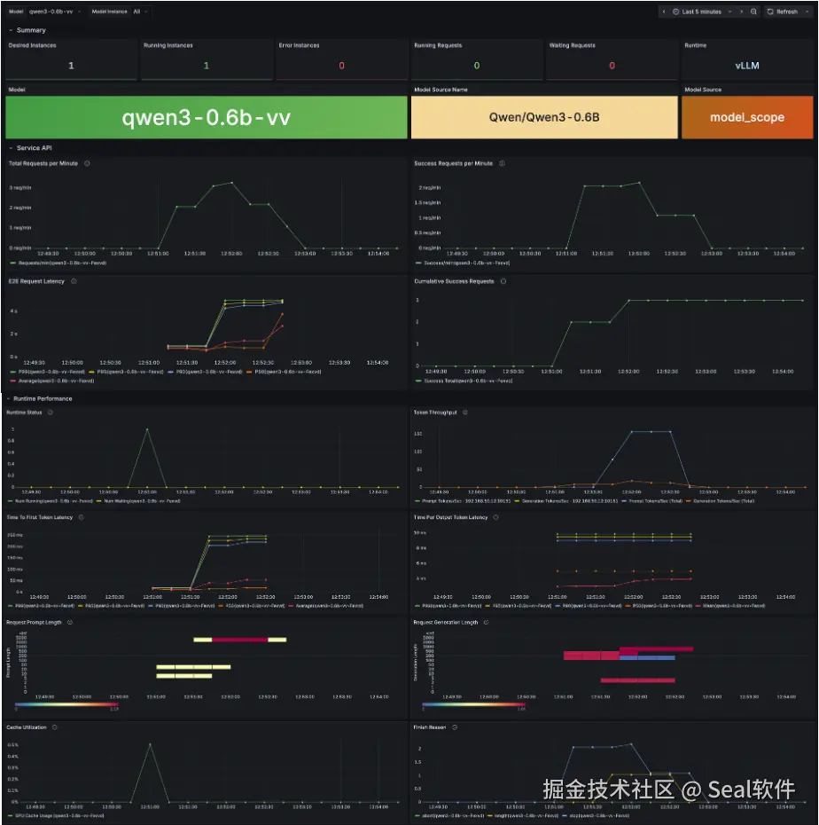 GPUStack v2 实时跟踪模型运行状态,包括推理错误、响应延迟和关键性能指标,通过可视化数据和报警机制,确保服务稳定可靠,并为异常排查提供强有力的数据支撑。