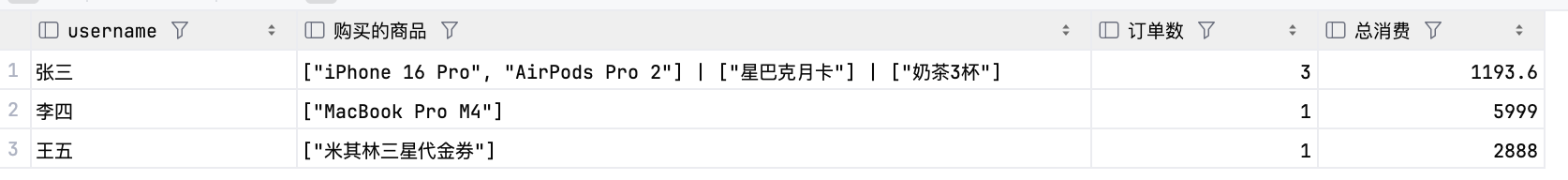 ('王五', ARRAY['VIP','上海','美食家'], '{"age": 41, "city": "上海", "hobbies": ["米其林","红酒"]}');