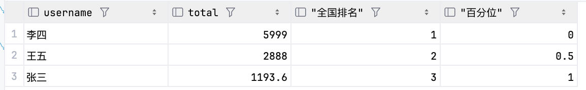 rank() OVER (ORDER BY sum(amount) DESC) AS "全国排名",