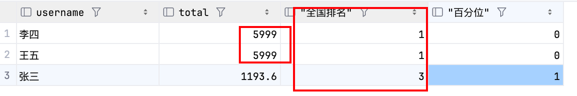 第三列是给用户按「总消费额」降序(DESC)排 "全国名次"。这个函数支持并列,比如把王五金额改成5999: