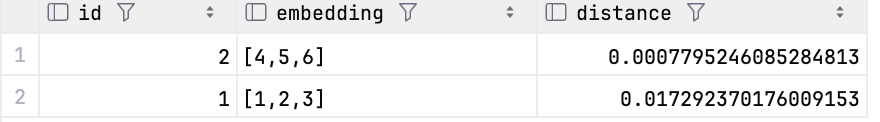 SELECT id, embedding, embedding <=> '[3,4,5]' AS distance
