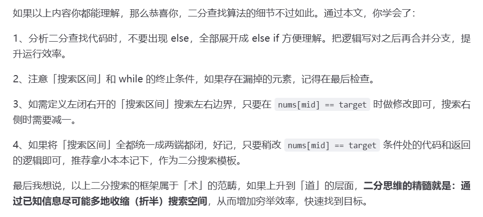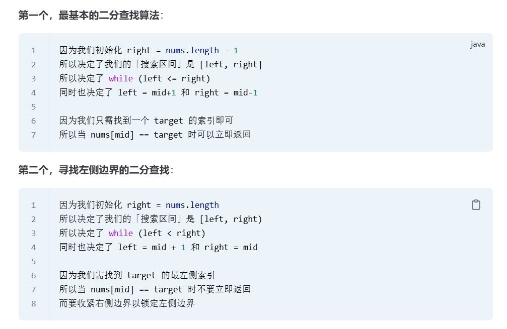 要理解这个二分搜索算法的边界处理核心 ,关键在于抓住三个核心设计的一致性:**right 的初始化值、while 循环条件、left/right 的更新逻辑。**这三者必须配套,否则会出现死循环或漏查元素的问题。下面逐点拆解边界处理的细节: