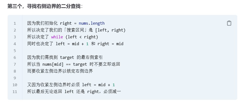 案例 3:右边界查找(LeetCode 34. 查找元素的第一个和最后一个位置 - 右边界部分)