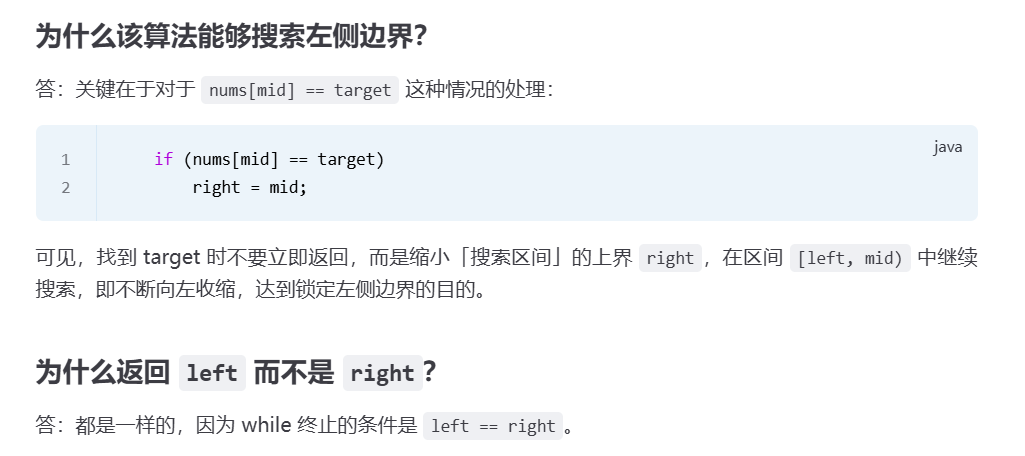 - nums [mid] == target → left=mid+1(扩大左边界,向右找);