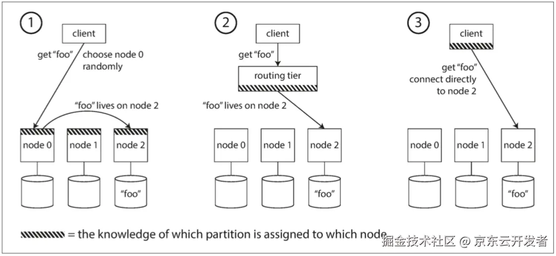 当我们已经将数据进行分区后,如何才能知道用户想要的数据在哪个节点上?这可以概括为是一个 服务发现 的问题。为了解决这个问题,可以通过如下图所示的三个方案