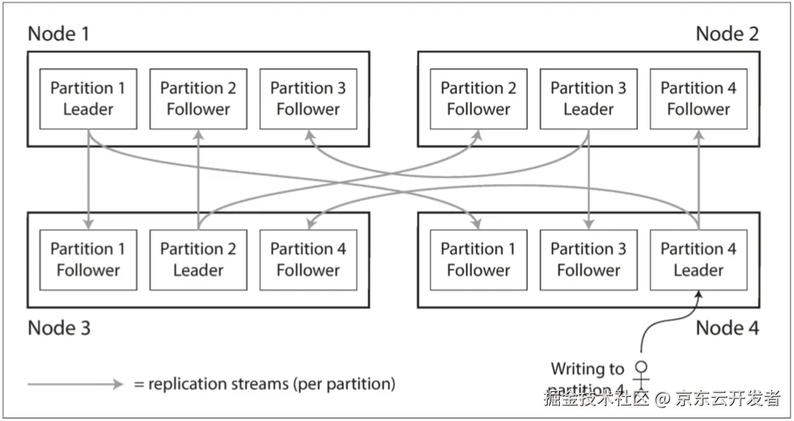 分区通常和复制结合使用,使得每个分区的副本存储在多个节点上,保证数据副本的 高可用。如下图所示,如果数据库被分区,每个分区都有一个主库。不同分区的主库可能在不同的节点上,每个节点可能是某些分区的主库,同时是其他分区的从库。
