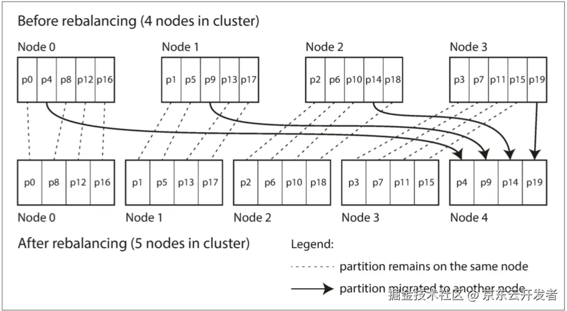 比较简单的再平衡分区策略是选择 固定数量的分区 ,当节点数量增加时,可以从原节点中 窃取 一些分区(当节点数量减少时,则发生相反的情况),如下图所示: