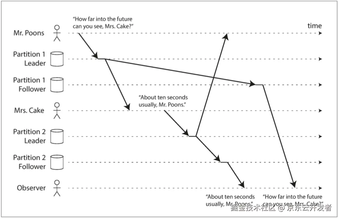 正常情况下,这段对话是有因果关系的(先问后答)。但是对于观察者,他看到的顺序却是先得到了答案,再看到了问题,这就是在分区数据库中,因复制延迟而产生的特殊情况。