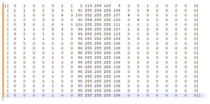 图片我们要处理下,先用opencv转成灰度图,0到255大小。20*20的二维数组。
