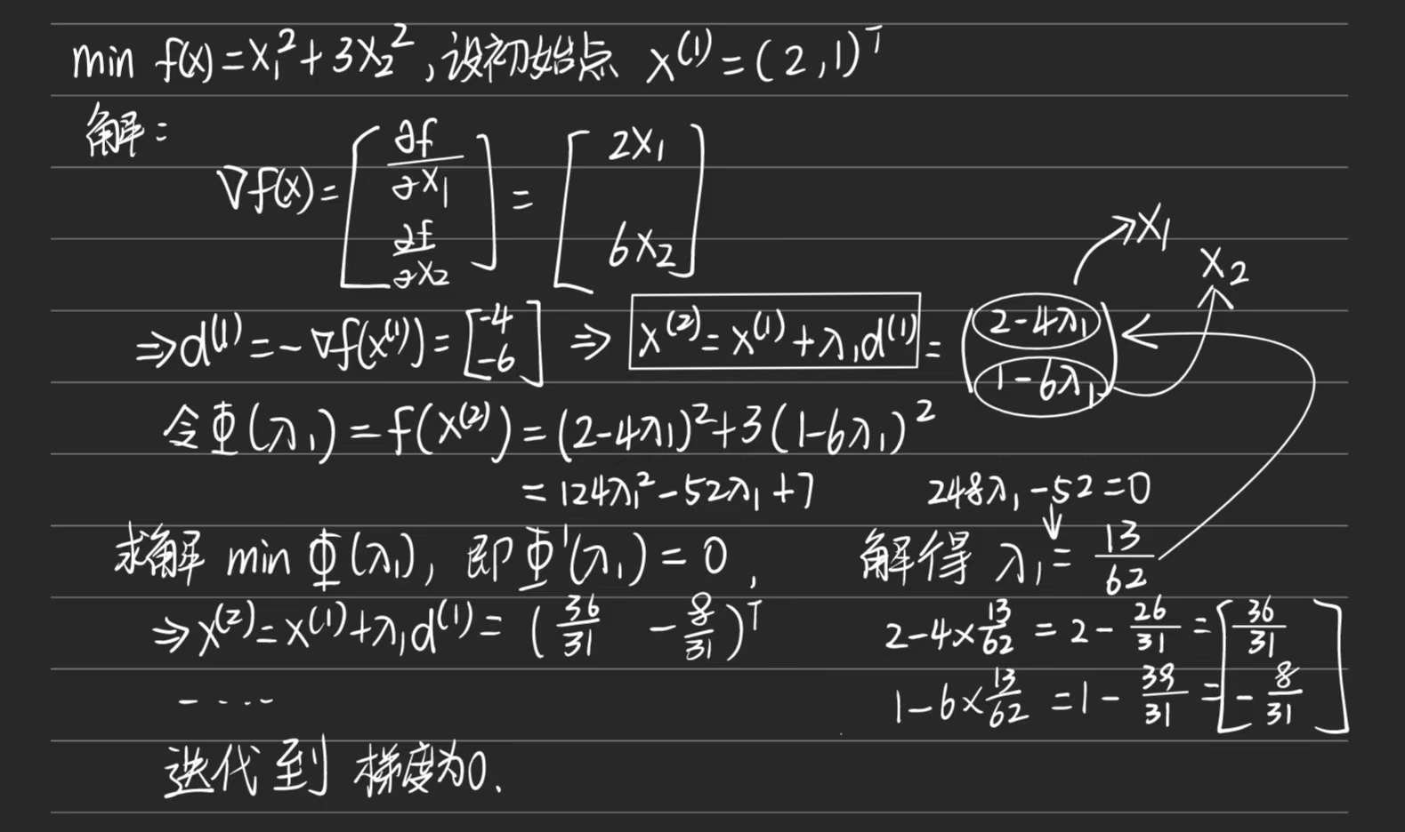 原理:基于一阶导数(梯度),在每次迭代中,沿着当前点的负梯度方向(即函数值下降最快的方向)移动。步长通常通过线搜索(如精确线搜索或回溯线搜索)确定。