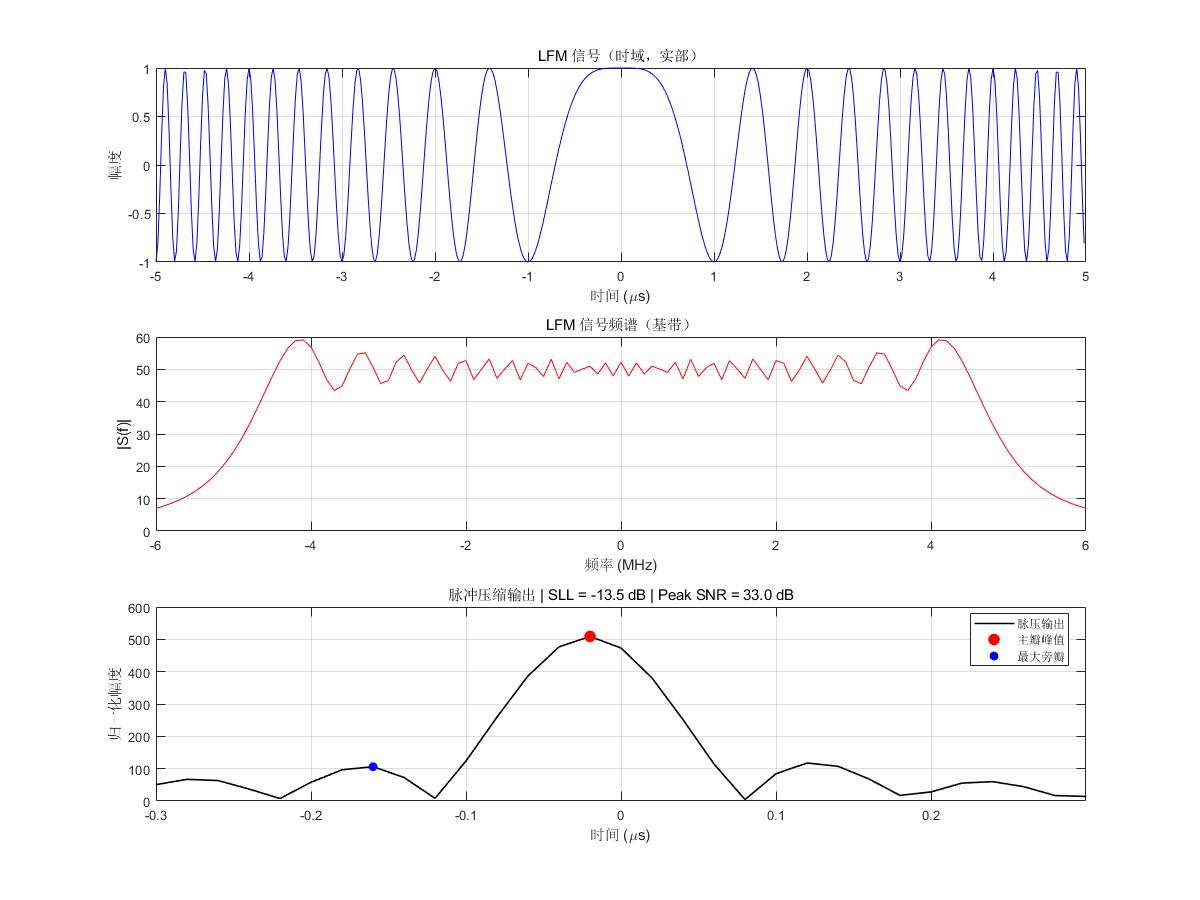 title(sprintf('脉冲压缩输出 | SLL = %.1f dB | Peak SNR = %.1f dB', SLL_dB, Peak_SNR_dB));