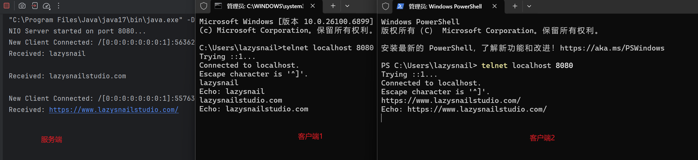 客户端可以用BIO写,也可以用NIO写。为了简单点,我就不写代码了,直接telnet。