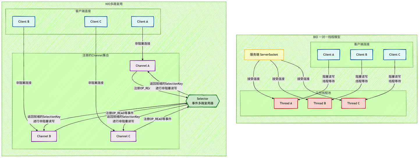 回顾我们的这两篇文章内容,从BIO的每个连接都必须独占一个线程,不管他是不是在真正工作。