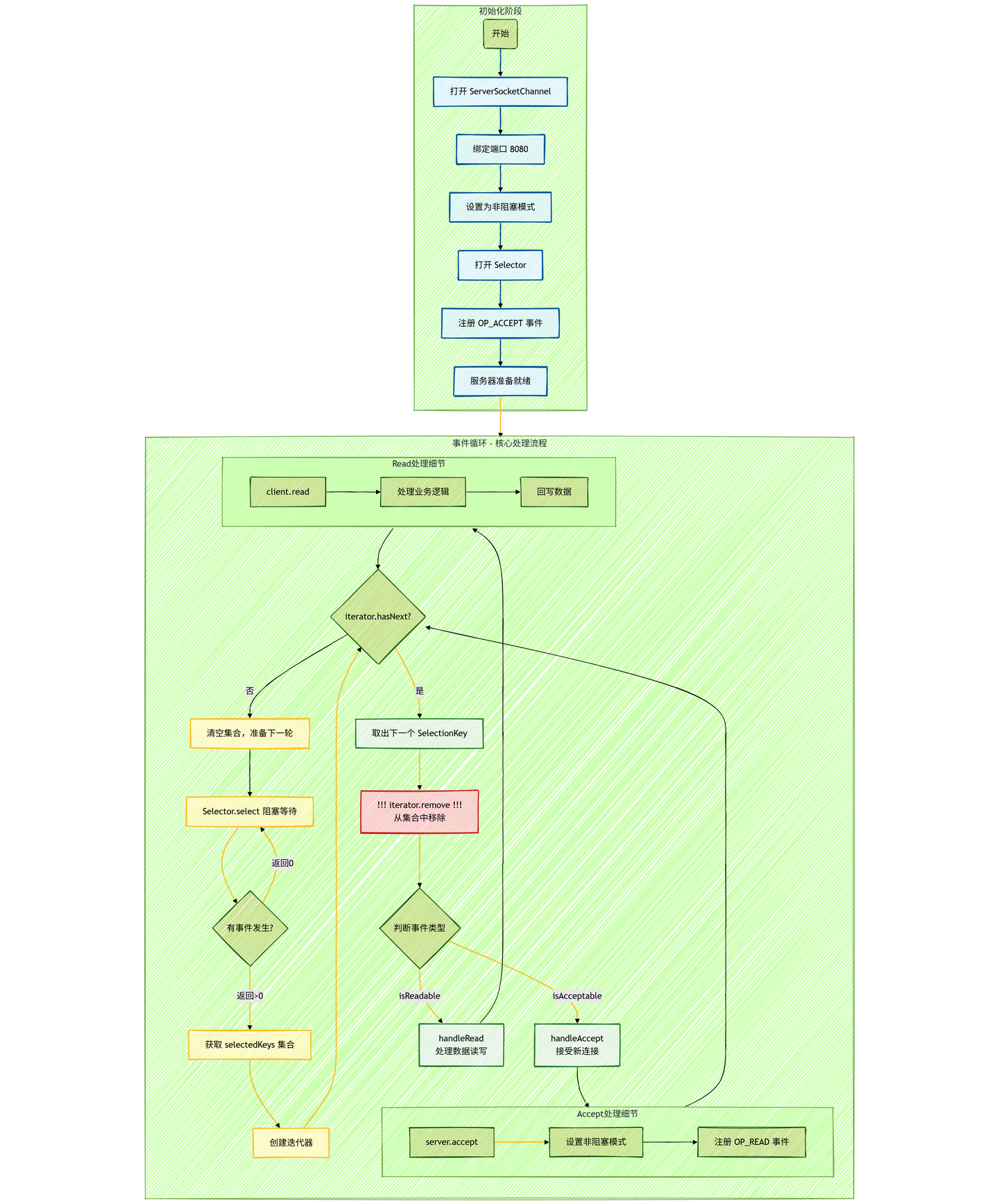 NIO的代码写起来确实比BIO要麻烦一些,但是逻辑还算清晰。
