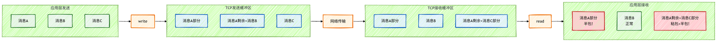 TCP为了性能(比如Nagle算法),不会我们发一个字节他就走一趟,而是会把几个小包凑成一个大包发出去(粘包),或者我们的包太大,他给我们切碎了发出去(半包)。