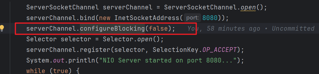 关键的是调用configureBlocking(false)把通道设置成非阻塞模式,不然后续注册到Selector的时候就会抛出IllegalBlockingModeException。