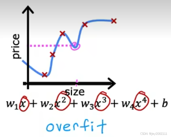- 现在我们的目标是最小化J(w⃗,b)J(\vec w, b)J(w ,b),它由两项组成,前者是均方误差(Mean Squared Error,MSE),后者是正则化项(Regularization Term),而λ\lambdaλ描述了对两者之间的重要性的权衡,前者鼓励算法的预测值更贴近训练集的真实值,而后者鼓励算法减小w而减少过拟合