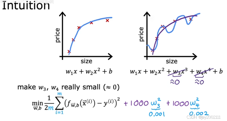 J(w⃗,b)=12m∑i=1m(fw⃗,b(x⃗(i))−y(i))2+λ∑j=1nwj2J(\vec w, b) = \frac{1}{2m}\sum_{i=1}^{m}(f_{\vec w, b}(\vec x^{(i)})-y^{(i)})^2 + \lambda\sum_{j=1}^{n}w_j^2J(w ,b)=2m1i=1∑m(fw ,b(x (i))−y(i))2+λj=1∑nwj2