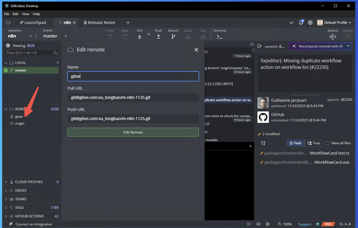 下面给出用 GitKraken 把一个仓库(例:GitHub)迁移到另一个平台(例:Gitee),并保留全部提交记录的做法。核心思路是给本地仓库新增一个"远程"(指向 Gitee),然后把所有分支与标签推送过去;或使用镜像推送一次性完成。