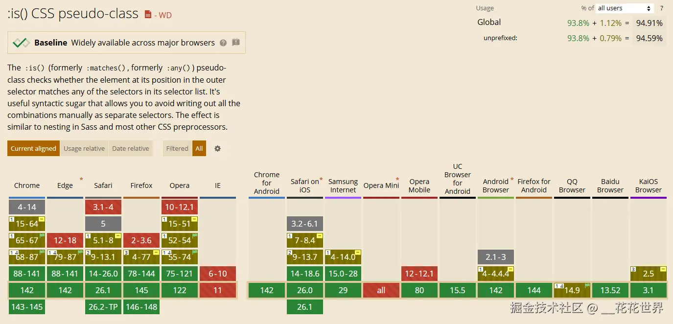 :where()选择器: 与 :is() 类似,但权重永远为 0,适合默认样式。