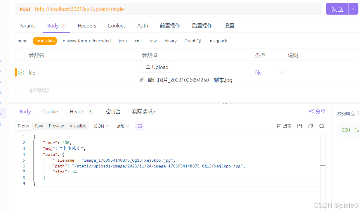 说明:单文件上传一次只能传一个文件,通过实例single方法实现,入参为上传表单的字段名(通常设为"file")