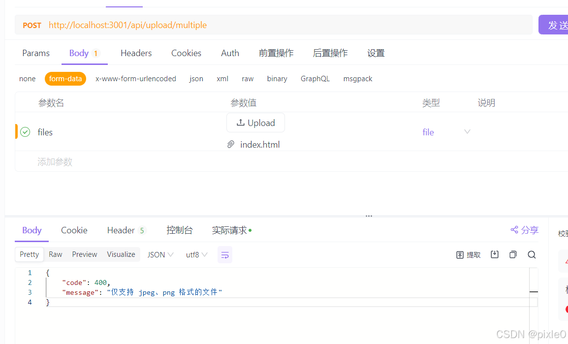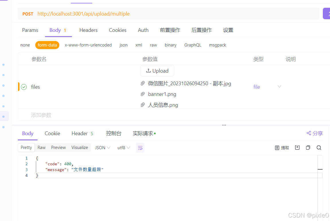 说明:多文件上传一次能传多个文件,通过实例array方法实现,第一个入参为上传表单的字段名(通常设为"files"),第二个入参表示允许的上传最大文件数