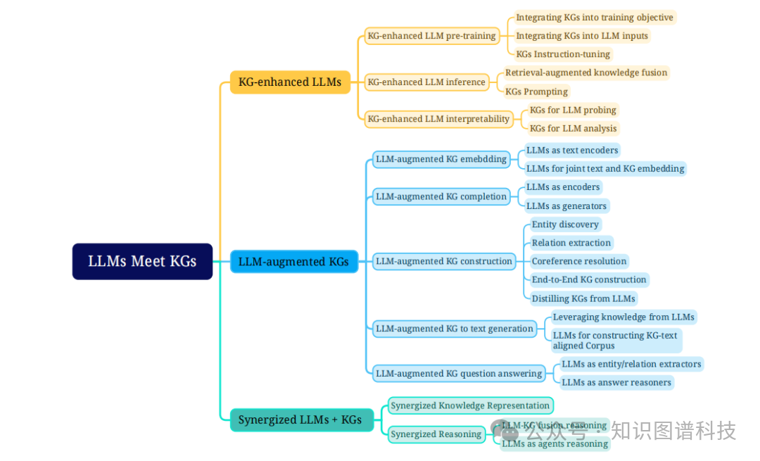 LLM增强的KGs(LLM-augmented KGs):利用LLMs完成不同的KG任务,如嵌入、补全、构建、图到文本生成和问答