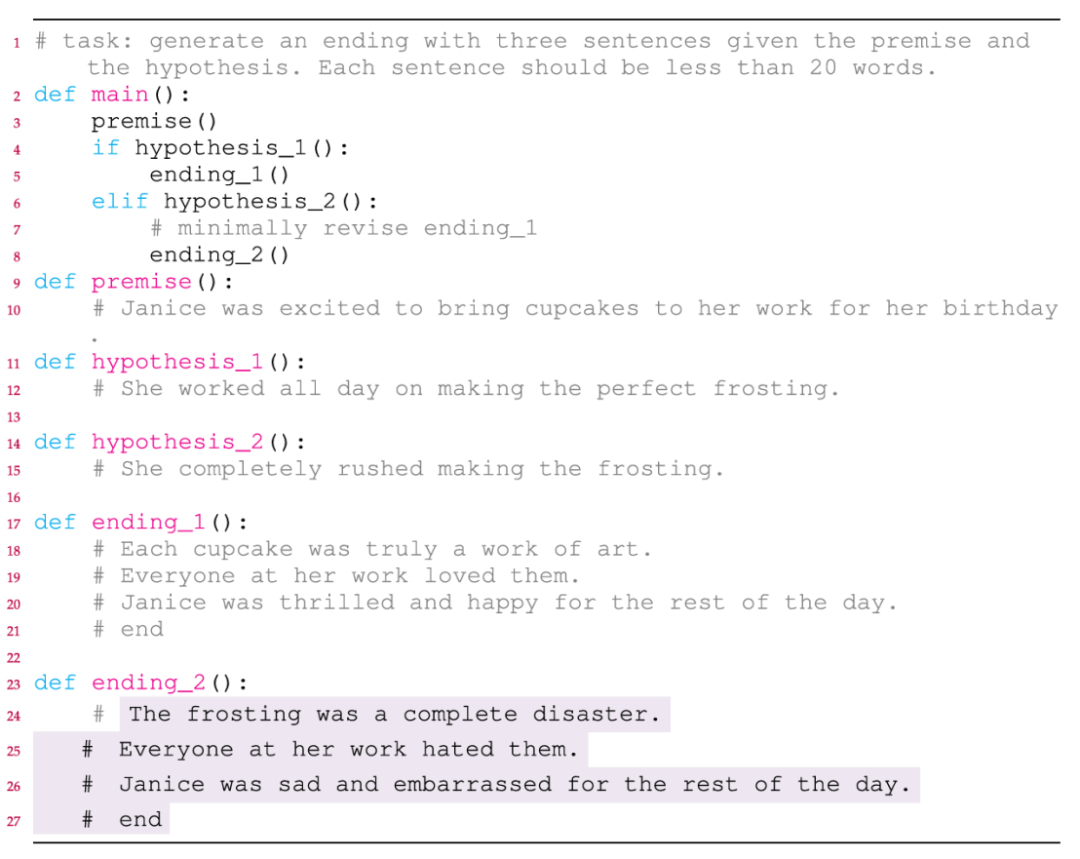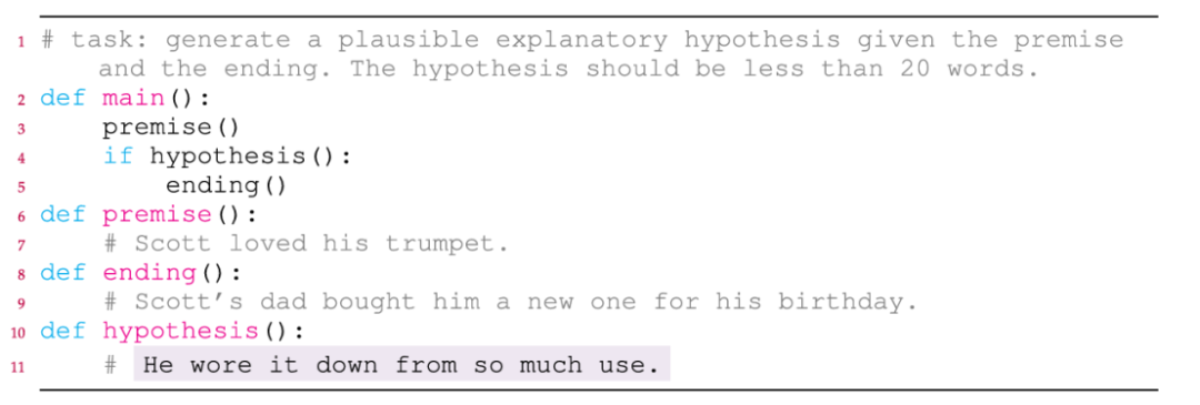 溯因推理的代码提示构建如图2所示,因果结构在主函数中通过执行流程来表示:执行前提,如果满足假设,则执行结局。事件内容以注释形式嵌入函数,目标函数置于末尾供模型生成