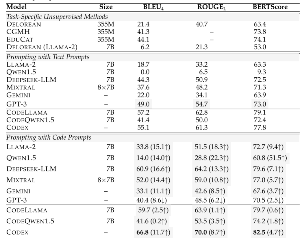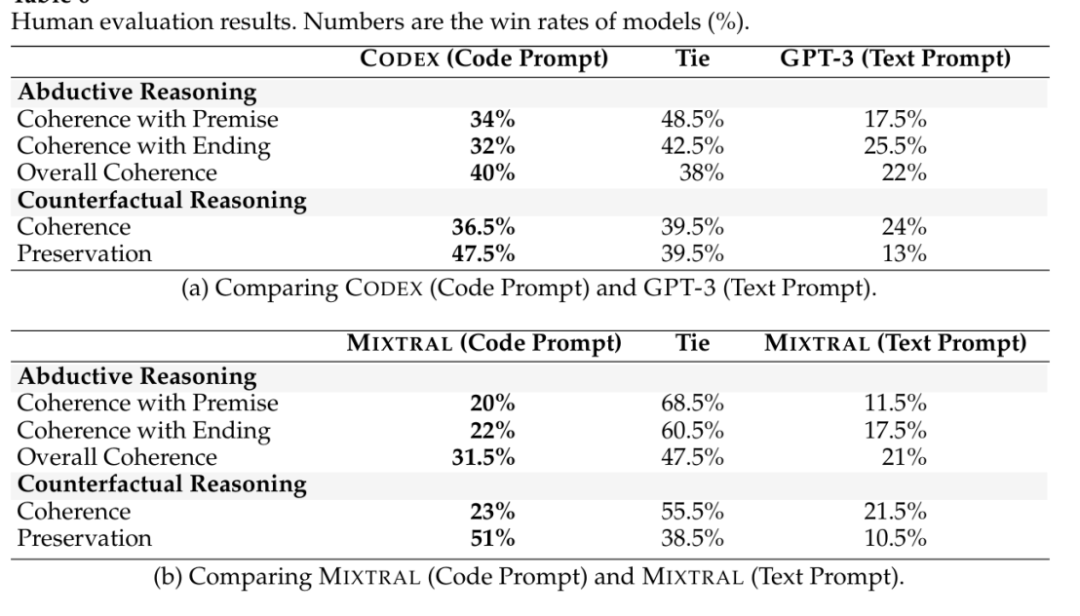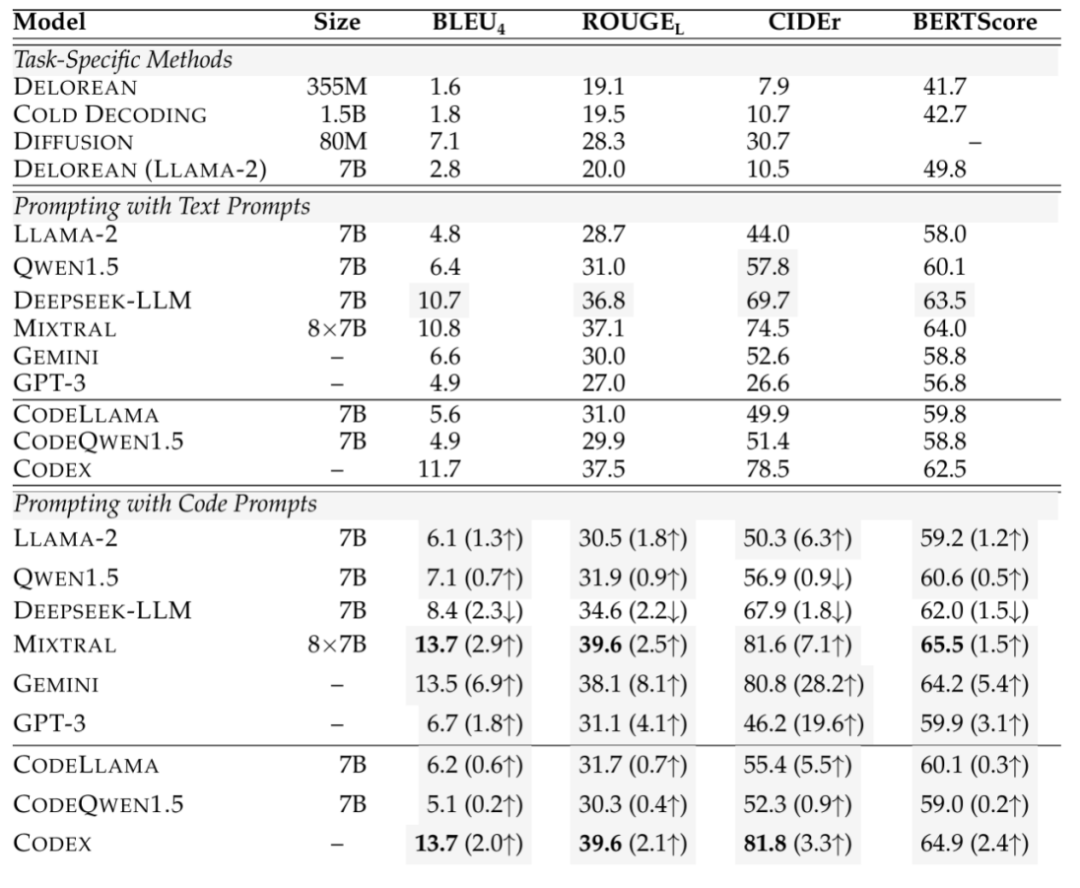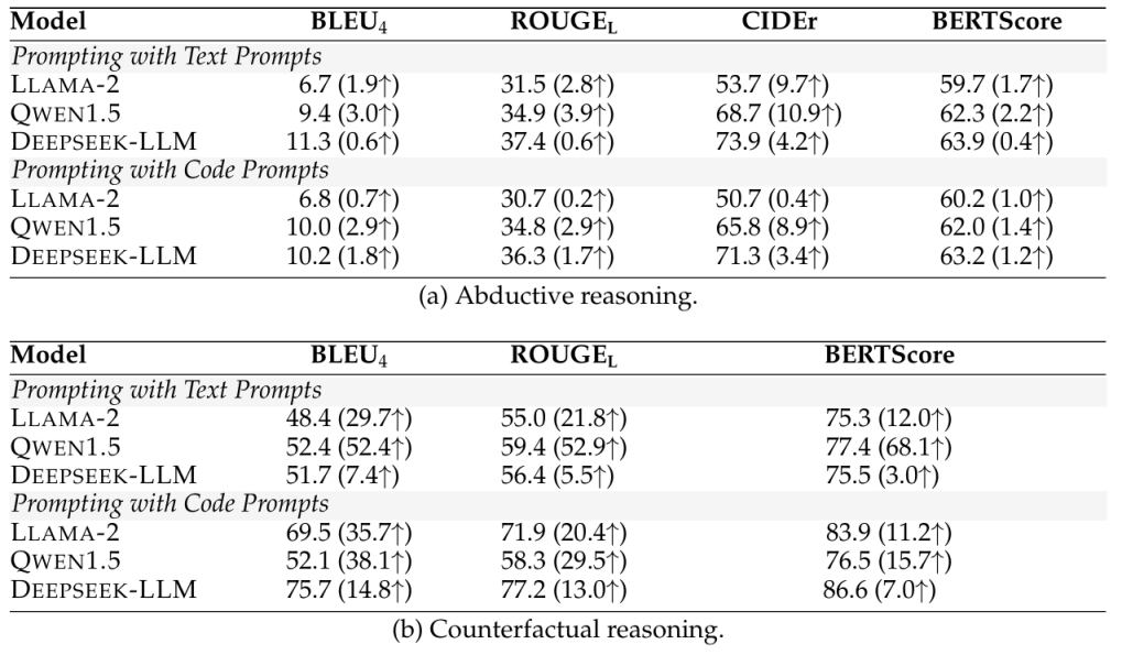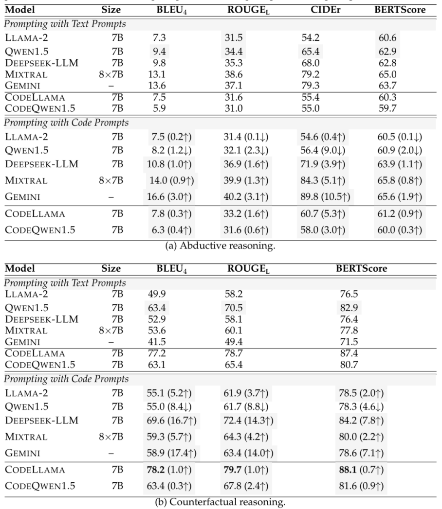 (2)在零样本和单样本设置下,全面评估多种通用LLMs(如LLAMA-2、GPT-3)和Code-LLMs(如CODELLAMA、CODEX)在溯因推理和反事实推理任务上的表现,并验证了代码大语言模型比通用大语言模型更擅长因果推理,并且对于大多数模型来说,代码提示比文本提示更有效。