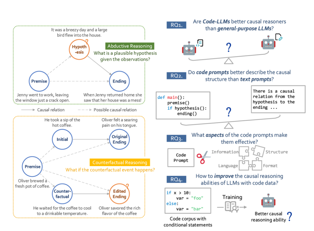 因果推理是人类思维的核心能力,但大型语言模型(LLMs)在处理复杂因果推理任务(如溯因推理和反事实推理)时仍面临挑战。其核心难点在于文本中复杂的因果结构(如多事件分支关系)通常隐含在时序描述中,难以被LLMs显式学习。而编程代码中的条件语句能更直接、频繁地表达因果关系,所以代码语言模型(Code-LLMs)可能具备更强的因果推理能力。因此亟需探索Code-LLMs是否比通用LLMs更擅长因果推理,以及代码提示是否能比文本提示更清晰地描述因果结构。