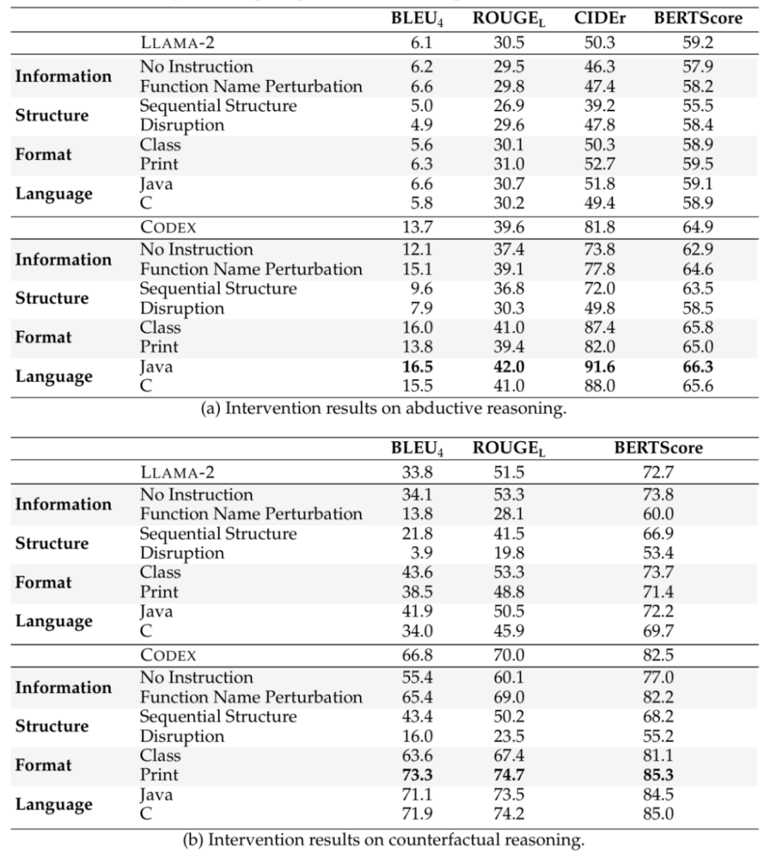 在干预提示实验中,在信息方面,研究两种类型的先验信息:任务指令和函数名,在"无指令"中,我们从提示中删除任务指令,在"函数名扰动"中,我们用匿名函数X替换原始函数名;在结构方面,一种是将条件结构转换为顺序结构,一种是随机打乱条件结构中函数的位置;在格式方面,除了原始格式外,还测试了两种格式:类和打印;在语言方面,将原始的Python程序转换为另外两种编程语言,Java和C,以评估编程语言的影响。实验结果如表5所示。