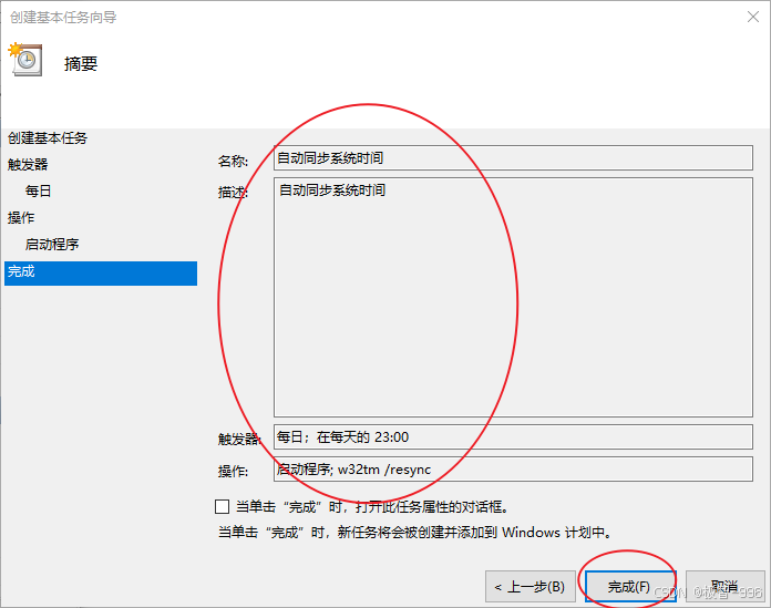 最后检查一下前面的设置有没有问题,没问题的话点击**"完成"**,这个自动同步任务就创建好啦!以后电脑会按照你设置的时间,自动校准时间,再也不用你操心啦!