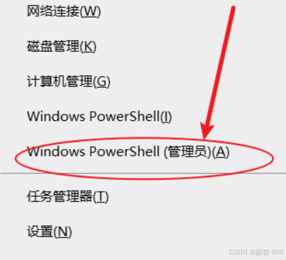 按下Windows+X 键,在弹出的快捷菜单中,选择**"Windows** PowerShell ( 管理员 )" ,以管理员身份来运行,命令提示符终端窗口。