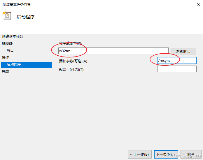 在 "程序 / 脚本" 框里,输入 "w32tm" ;在 "添加参数" 框里,输入 "/resync",然后点击 "下一步"。