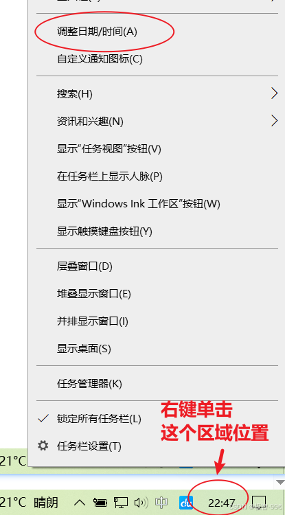 右键点击任务栏右下角 时间区域位置,然后选择**"调整日期/时间"**,这一步操作最容易了!