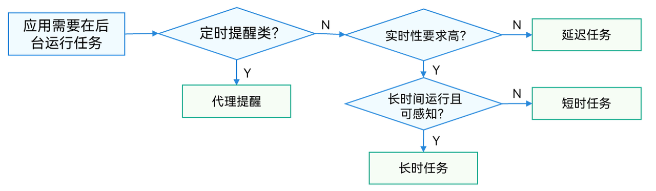 - 延迟任务:对于实时性要求不高、可延迟执行的任务。系统提供了延迟任务,即满足条件的应用退至后台被放入执行队列,系统会根据内存、功耗等统一调度。