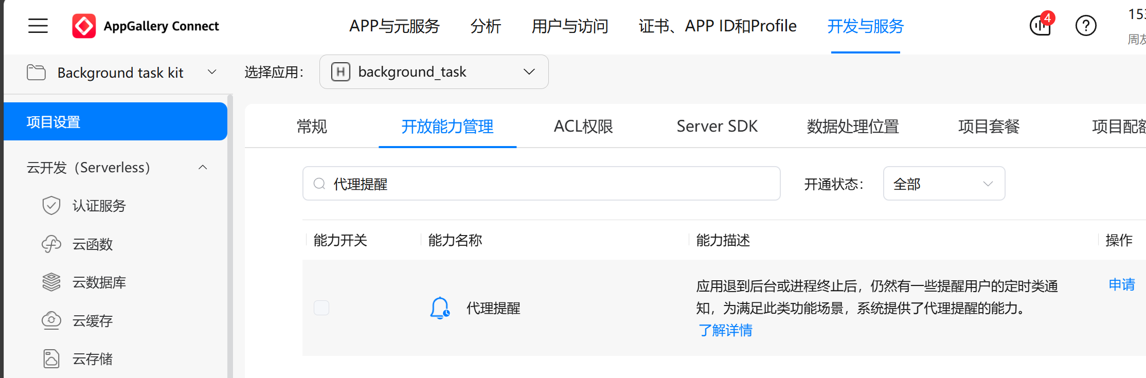 3.进入"项目设置"->"开放能力管理"页面,点击"代理提醒"卡片对应的"申请"按钮。