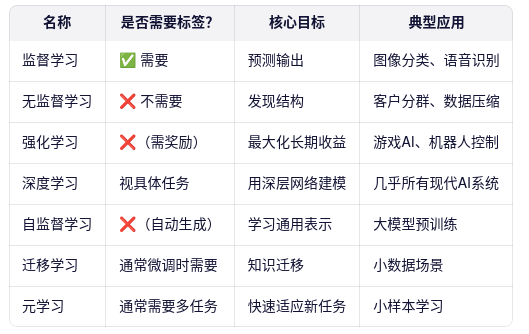 人工智能(AI)中,机器学习(ML)领域有多个密切相关但各有侧重的"专业类别"或子领域。它们常常被并列讨论,有时还会交叉融合。下面系统梳理这些相似或相邻的专业名词类别,并说明它们之间的关系与区别: