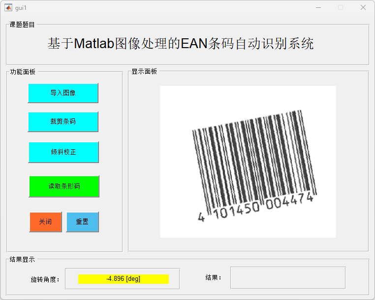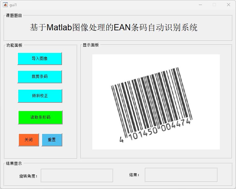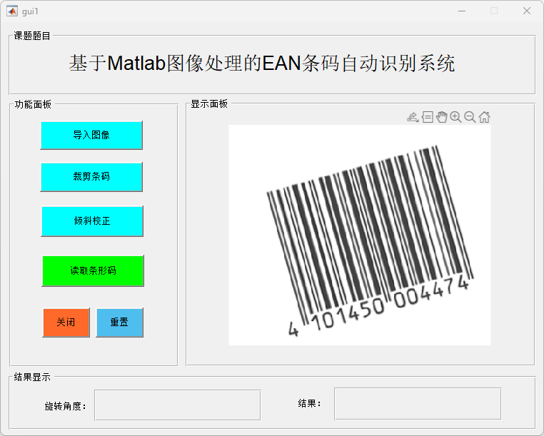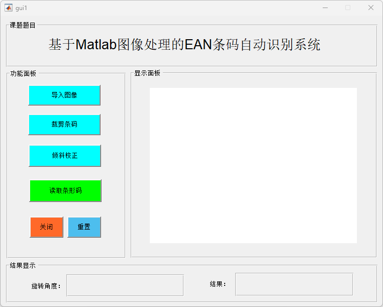 展示基于 MATLAB 所设计的 EAN 条码自动识别系统主界面,包括功能面板、显示面板以及结果显示区域。