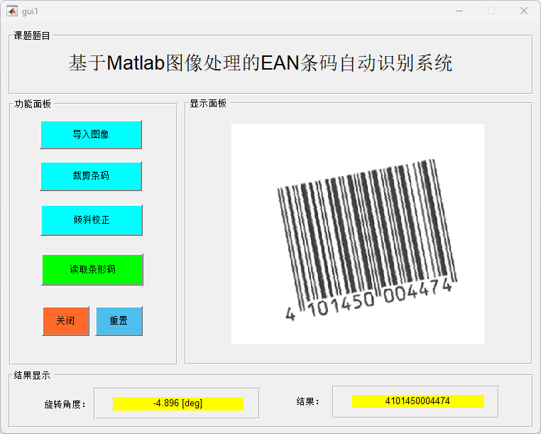 本研究面向商品条码自动识别应用,基于图像处理技术构建了 EAN 系列条码识别系统,并以 MATLAB 实现完整算法流程及可视化界面。针对实际采集中常见的条码倾斜、光照不均与背景干扰等问题,设计了包含图像预处理、条纹结构分析、模块拟合与编码解读在内的识别框架。