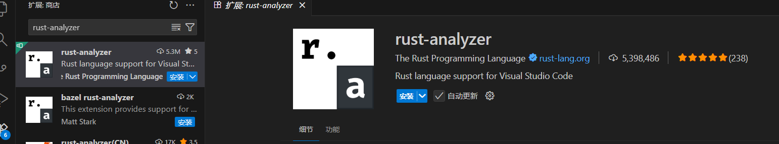 在VScode里面通过扩展搜索"rust-analyzer"来找到并安装它